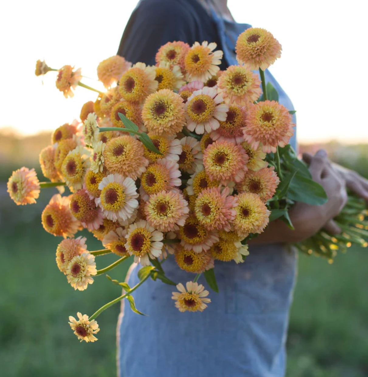 Novelty scabiosa-type blooms. 2–2 1/2" fully double, semi-double, and approximately 20% single flowers. Unique salmon color with cream-to-rose petals and a distinct dark eye. Cut-and-come-again flower, yielding multiple cuts over the season.